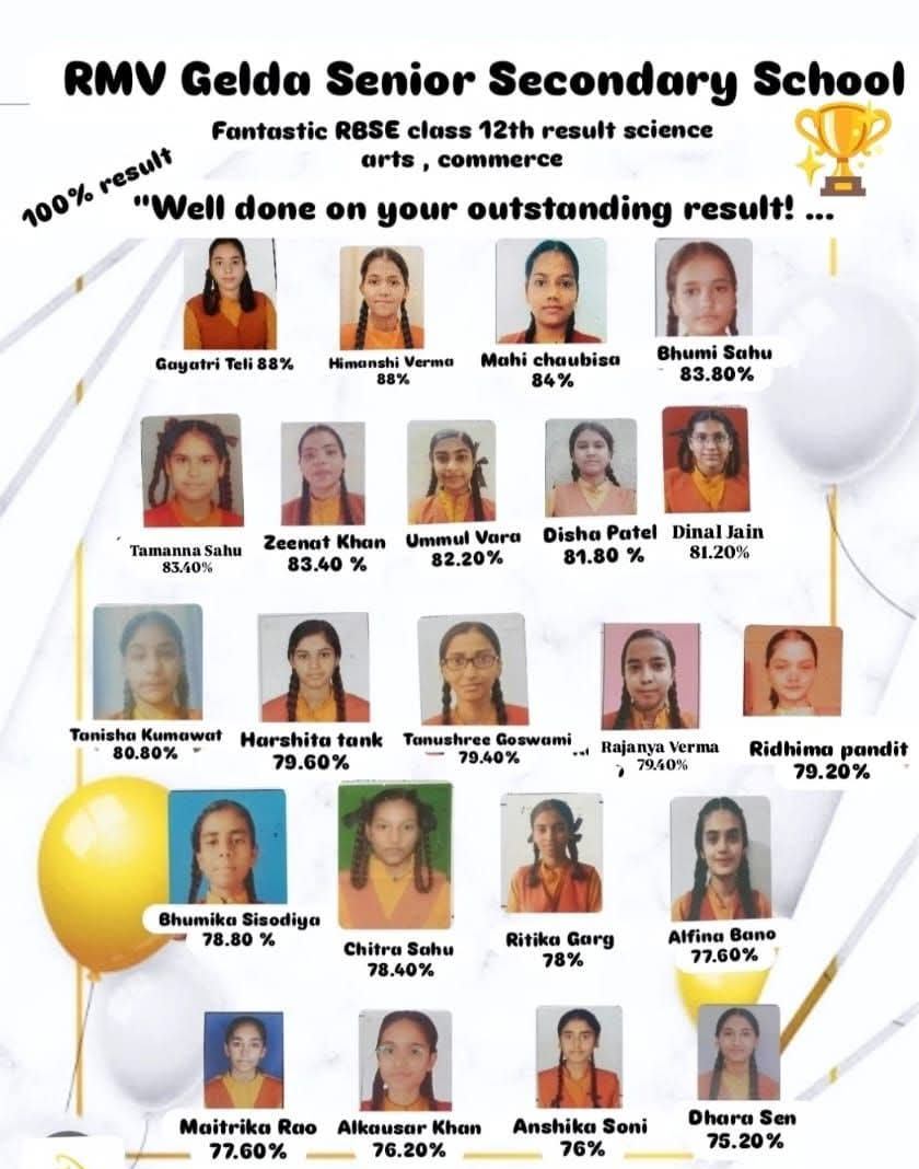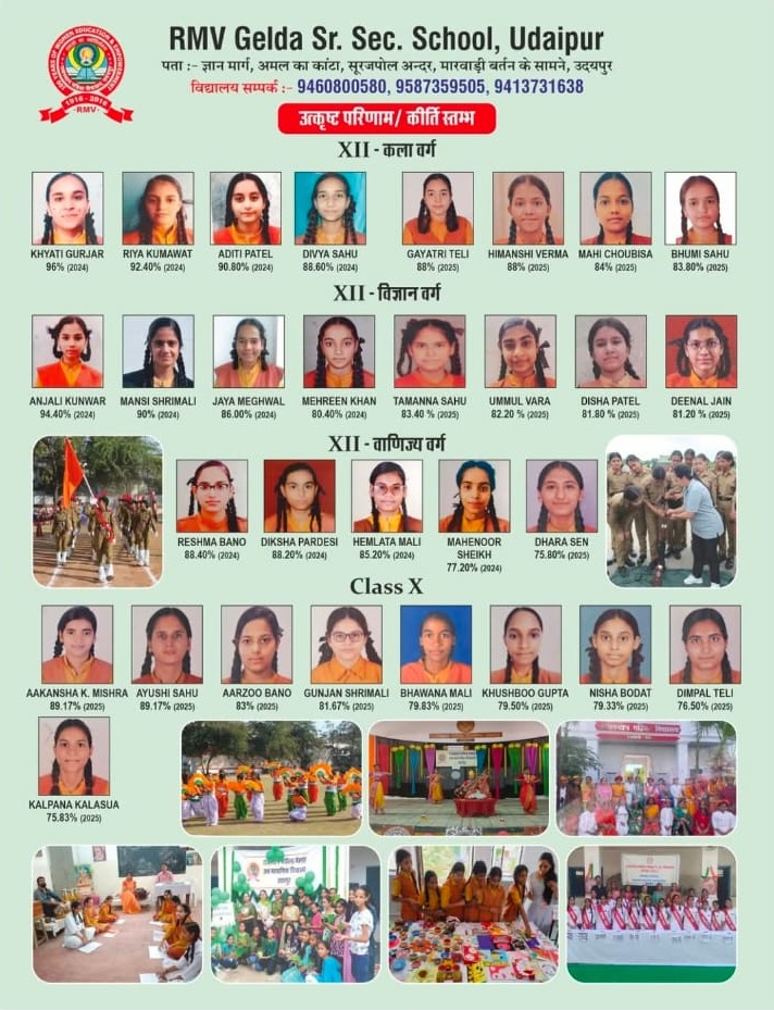 Rajasthan Mahila Gelda Senior Secondary School (RMV in short) established in year 1916 has long been recognized as a premier institution of secondary and higher secondary learning for girls. RMV is a centre of academic excellence and achievement. It is today one of the finest institutions in the heart of the city of lakes, Udaipur. Our institute’s striving is to imbue the teaching/learning process with a unique blend of intellectual rigor, aesthetic and ethical engagements. Our school has completed 100 years of glorious service as a pioneer in girls’ education. The school provides knowledge through value education and character building with honor and dignity.
